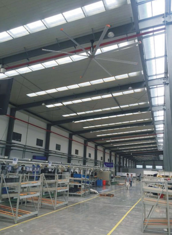 我公司生產的大型工業吊扇直接懸掛在廠房屋梁下,風力柔和,能加快車間空氣流通,有效降低車間內溫度,改善車間空氣環境質量,有利于員工的身體健康。